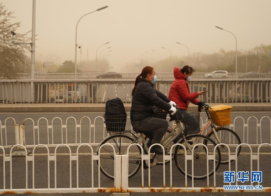 3月15日,市民騎車行駛在北京德勝門附近的道路上。當(dāng)日,我國北方多地出現(xiàn)沙塵天氣。新華社記者 賈浩成 攝