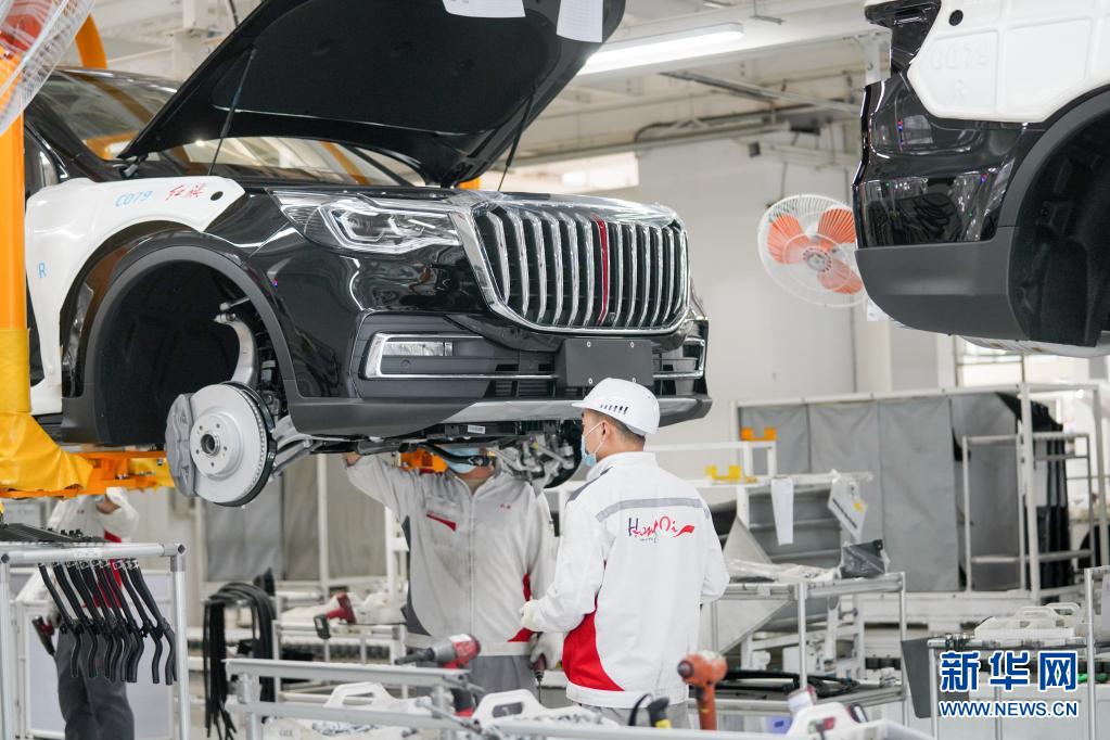 在位于吉林長春的一汽紅旗工廠總裝車間,工人在裝配車輛(4月28日攝)。