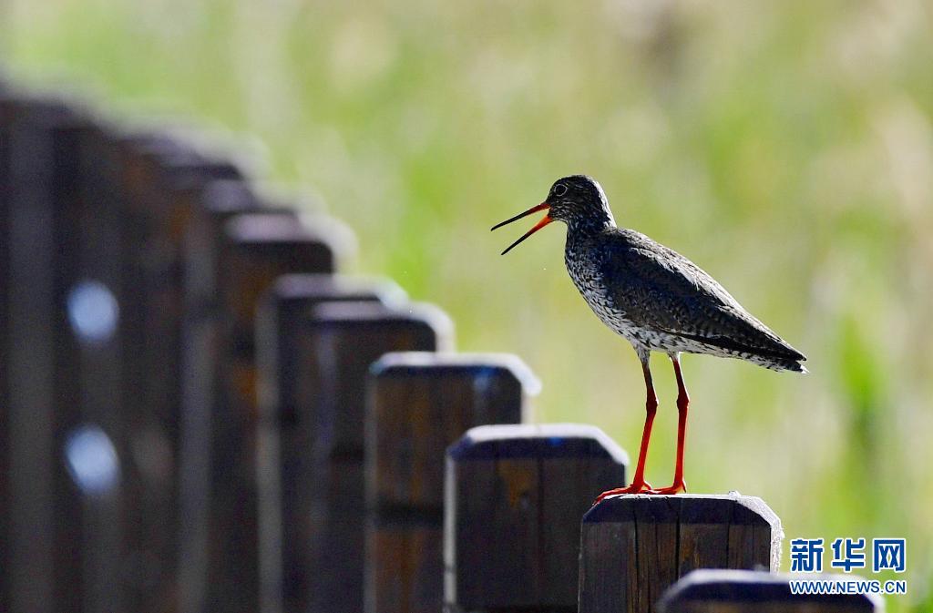 初夏,紅腳鷸在位于西藏拉薩的拉魯濕地國家級自然保護區(qū)內(nèi)起舞覓食。