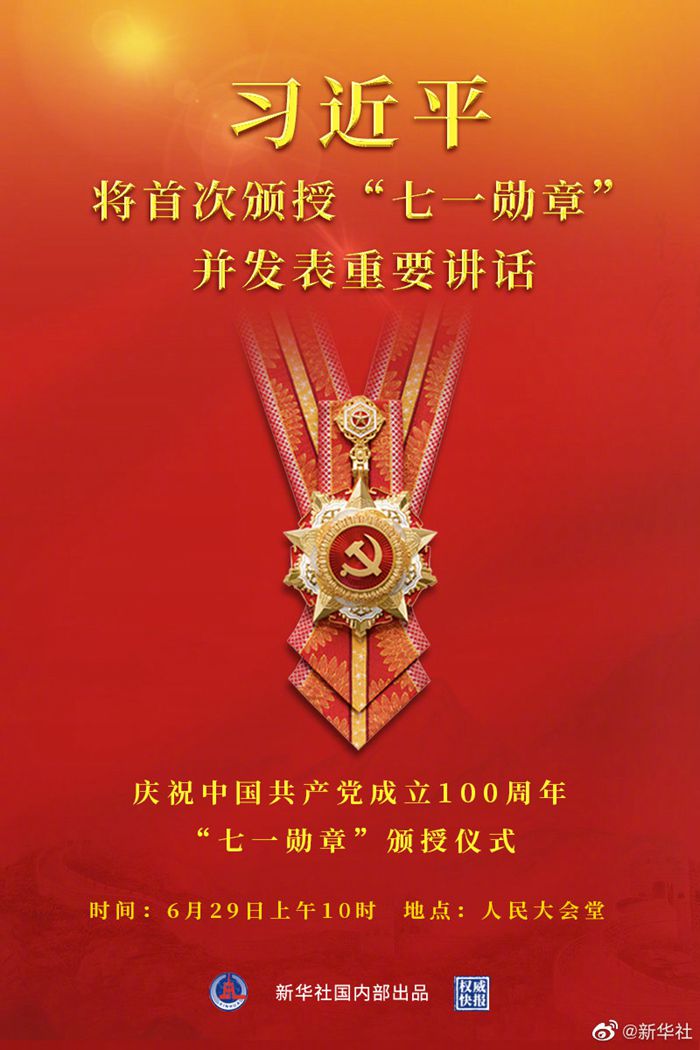 慶祝中國共產黨成立100周年“七一勛章”頒授儀式將于29日上午10時在人民大會堂隆重舉行。習近平為“七一勛章”獲得者頒授勛章并發(fā)表重要講話。