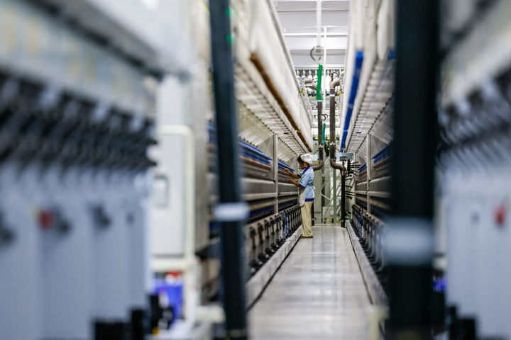 10月23日拍摄的位于江苏省南通市崇川区的江苏大生集团碳中和智慧纺纱工厂生产车间。江苏大生集团有限公司的前身为大生纱厂,由中国近代实业家张謇先生于1895年创办。大生集团积极推进“智改数转”工作,建设数字化车间和智慧纺纱工厂。新华社记者 李博 摄