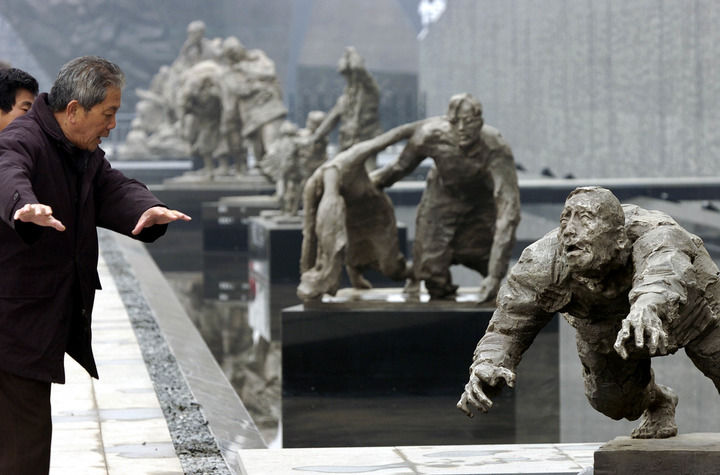2007年12月11日,市民在扩建后的侵华日军南京大屠杀遇难同胞纪念馆观看组雕《逃难》。 新华社记者 孙参 摄