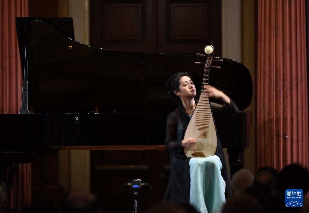 8月10日,在奥地利维也纳,演奏者表演琵琶独奏《琵琶辞》。