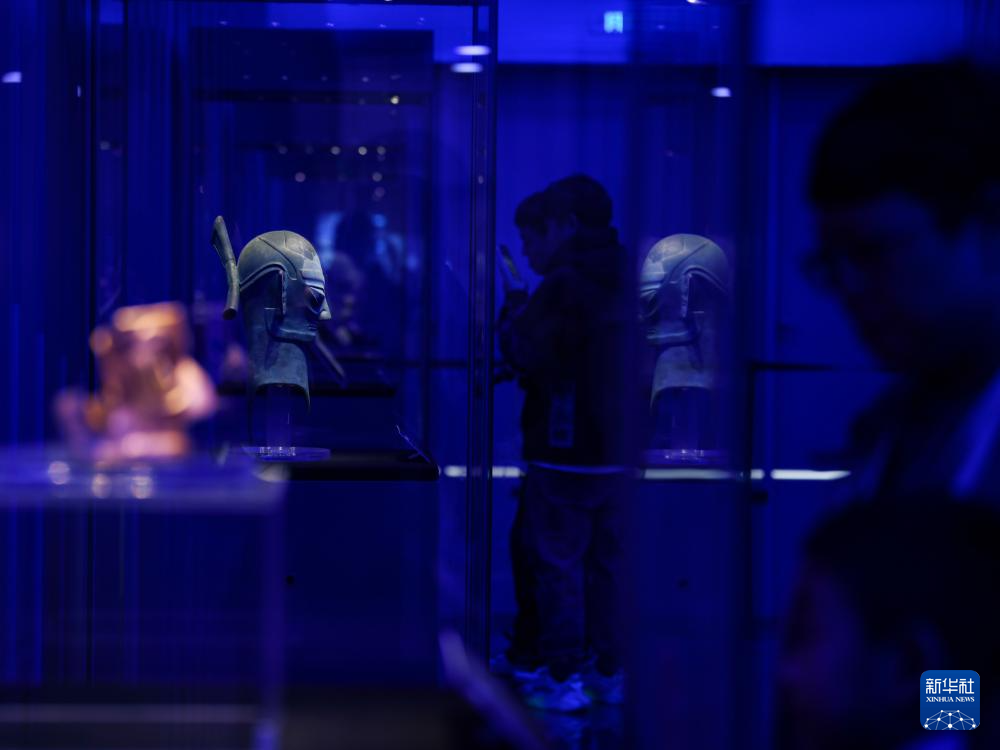 10月19日,在2023成都世界科幻大会主场馆雨果厅,观众在观看金沙遗址出土文物的仿制品。