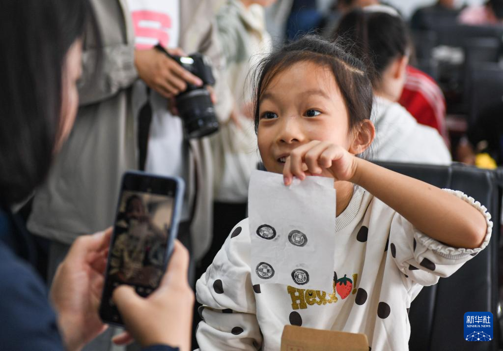 10月21日,一名小朋友向家长展示她制作的铜钱拓片。