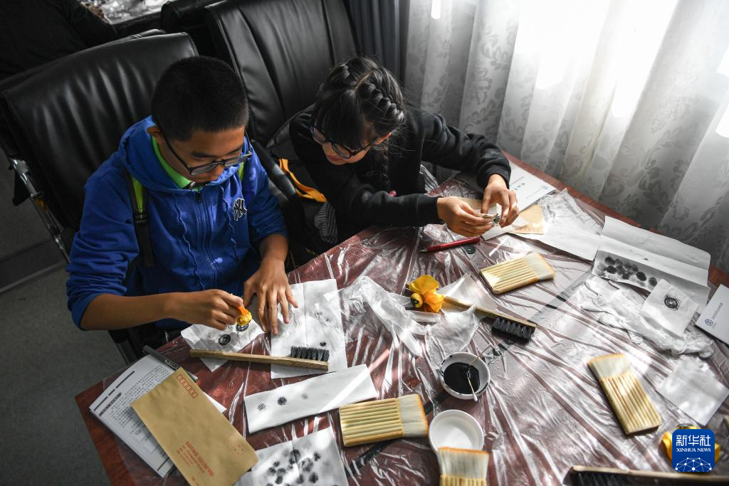 10月21日,小朋友在学习制作铜钱拓片。