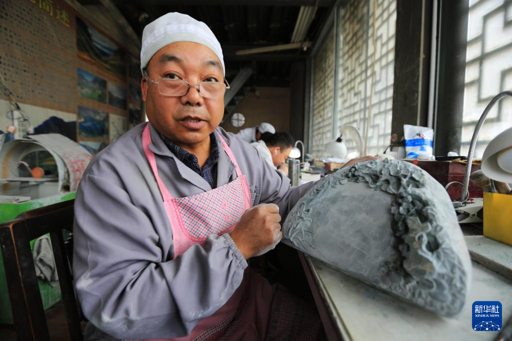 10月24日,艺人在甘肃省定西市临洮县洮砚艺术馆打磨洮砚。