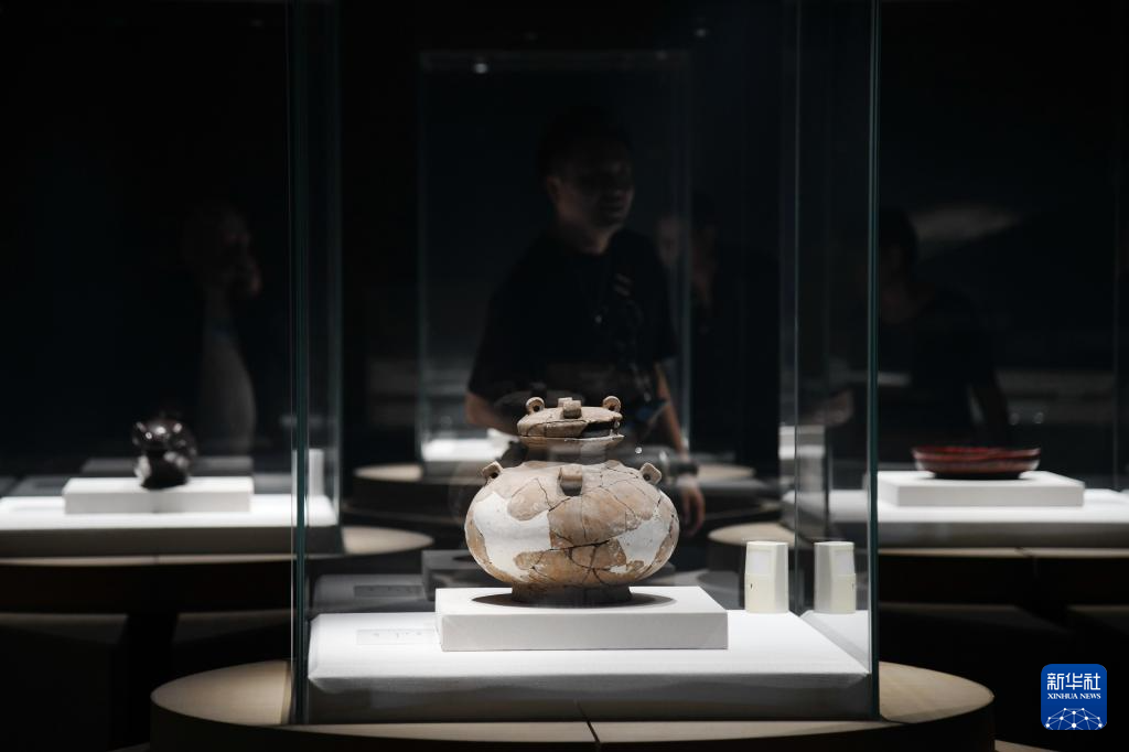 10月25日,观众在秦始皇帝陵博物院观看荆州博物馆馆藏文物鸟纹漆盂。