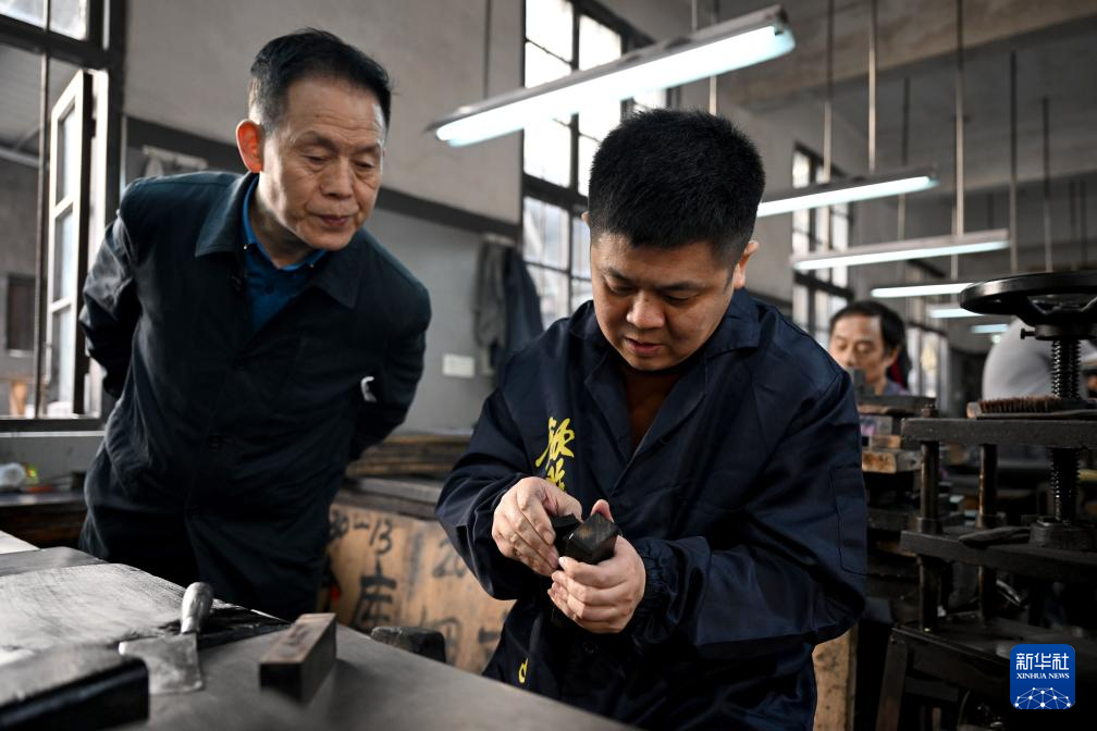 10月24日,在安徽省黄山市歙县老胡开文墨业有限公司,周健(右)在父亲周美洪的注视下从墨模中取出压制好的墨。