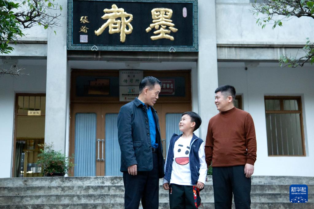 10月24日,在安徽省黄山市歙县老胡开文墨业有限公司,周美洪(左一)与儿子周健(右一)、孙子周墨合影。