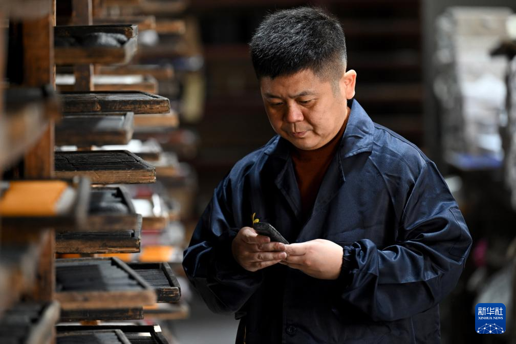 10月24日,在安徽省黄山市歙县老胡开文墨业有限公司,周健在雕刻墨模。