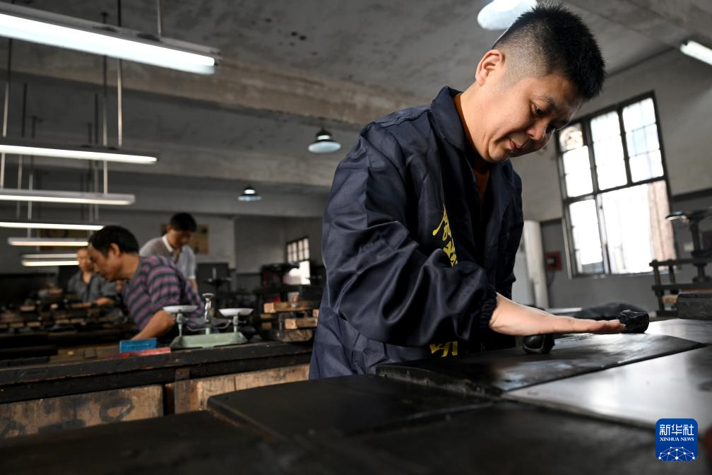 10月25日,在安徽省黄山市歙县老胡开文墨业有限公司,工人将骨胶与烟灰混合后的墨泥锤打成墨饼。