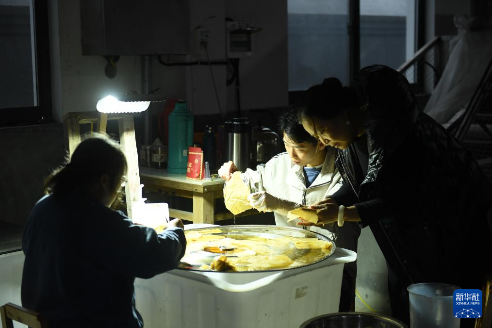 11月9日,工作人员在开化纸传统技艺工坊对修复用纸进行人工除杂。