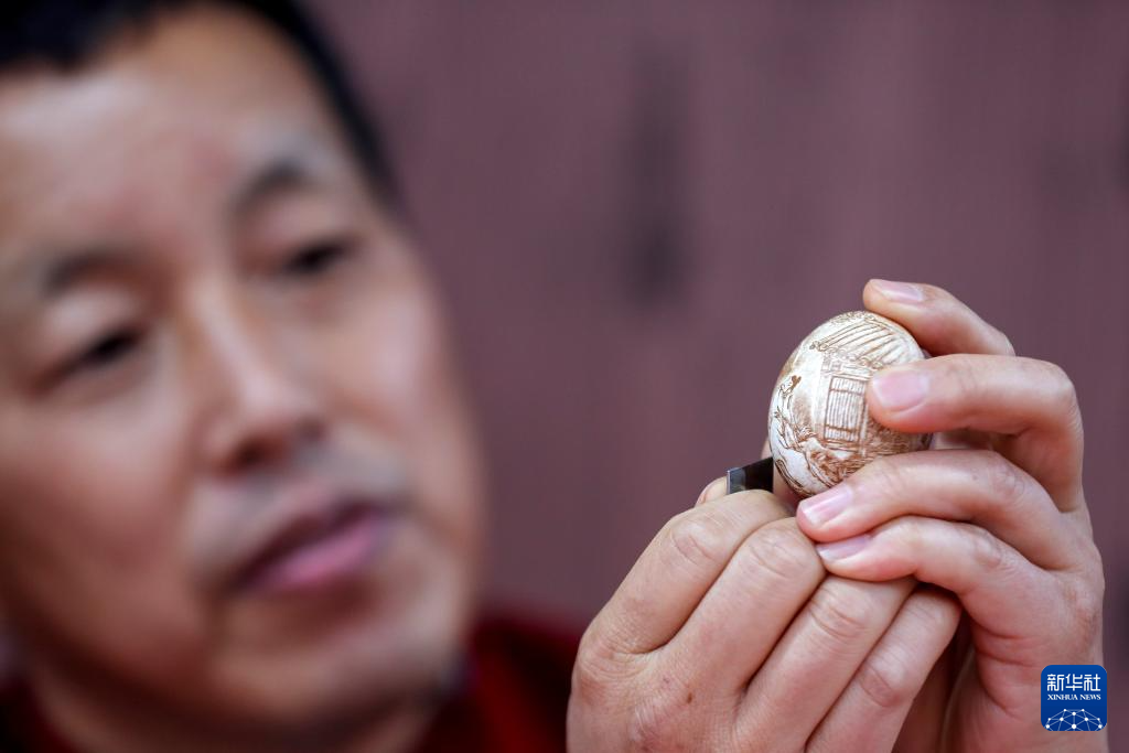 11月10日,非遗传承人王剑在第六届中国非物质文化遗产传统技艺大展上展示“庐州蛋雕”非遗传统技艺。