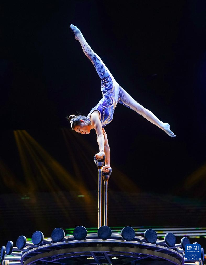 这是江苏省杂技团带来的杂技《凌云——倒立技巧》(11月17日摄)。