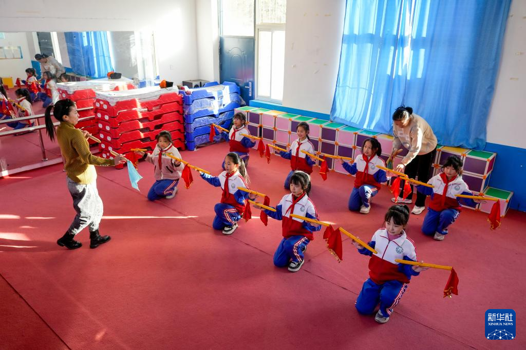 11月22日,地秧歌艺人在河北省滦州市小闫营小学指导学生练习地秧歌。