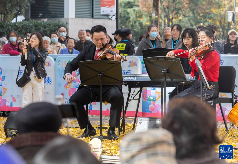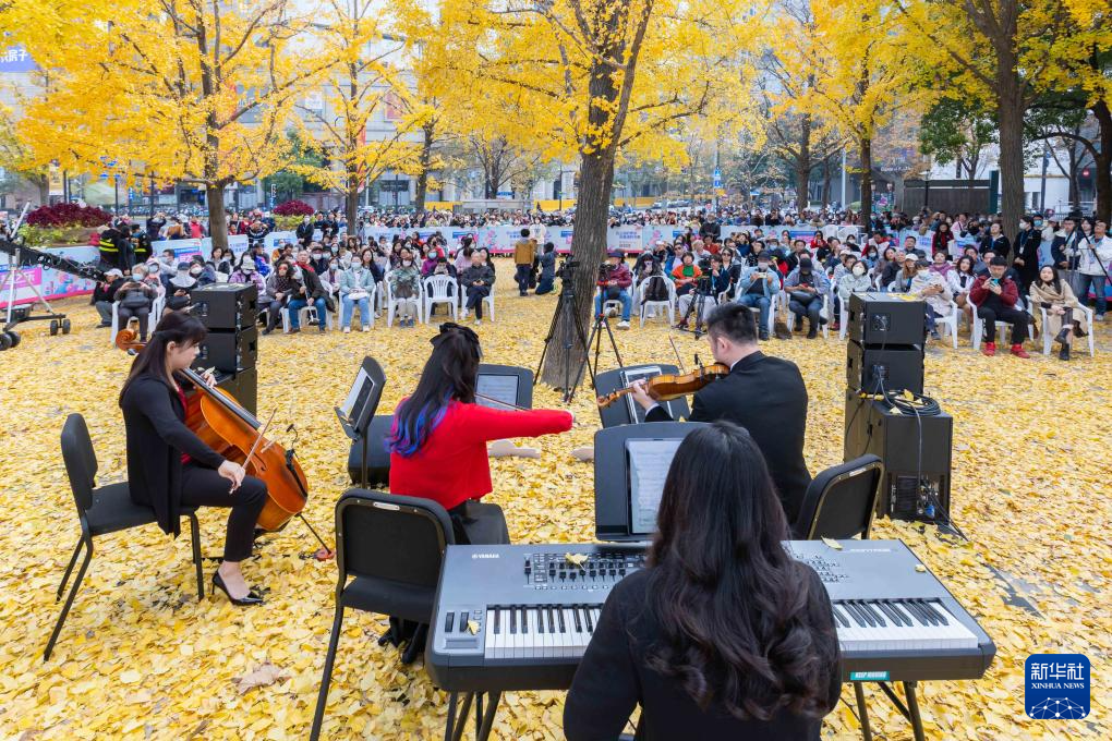12月9日,青年音乐家们在银杏树下演奏音乐。