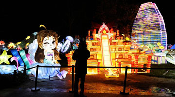 12月16日,工程师在巡游时操作大型机械装置艺术品“龙马精神”的步伐和姿态。