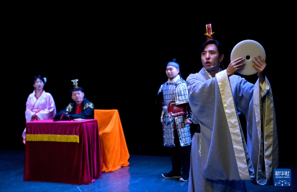 西安市说唱艺术团在大明宫剧院演出课本剧《将相和》(2023年12月30日摄)。