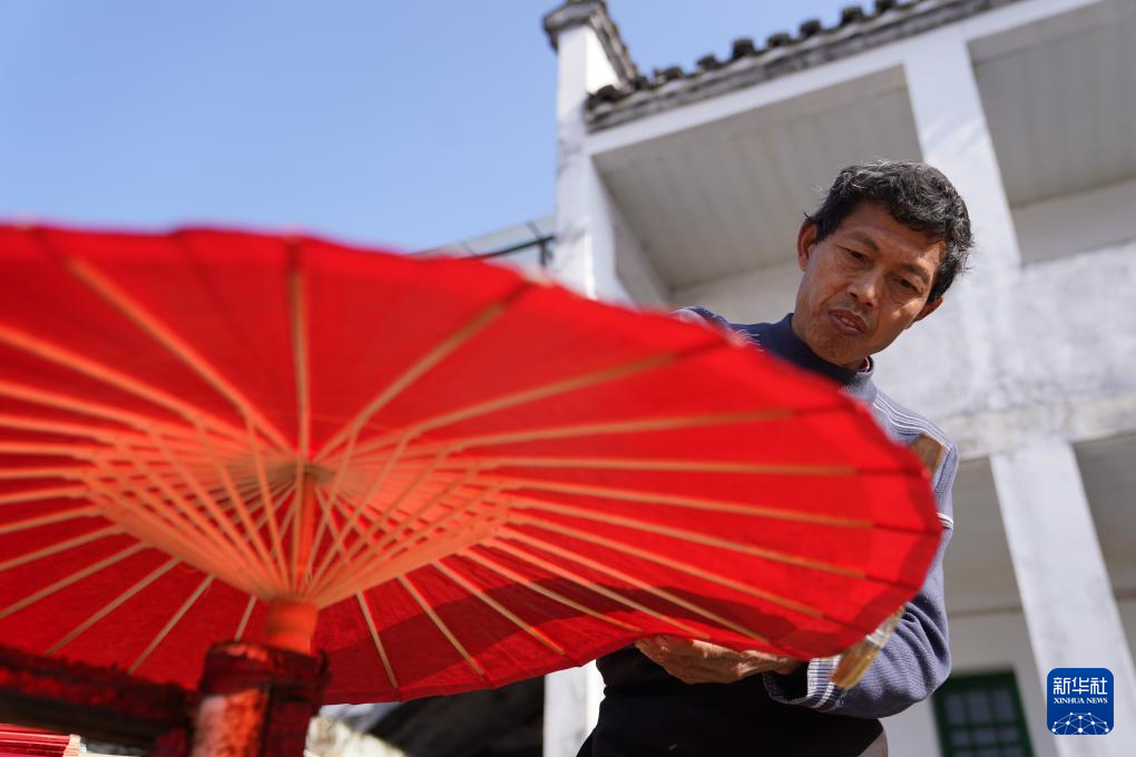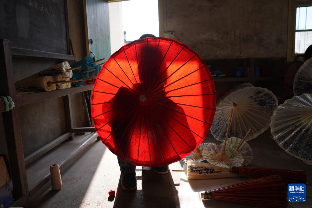 江西省婺源县赋春镇甲路村的工匠为甲路纸伞上桐油(1月11日摄)。