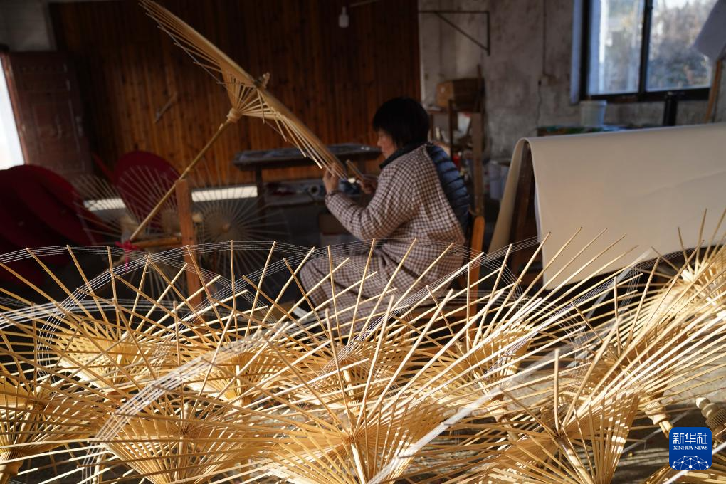江西省婺源县赋春镇甲路村的工匠为甲路纸伞贴伞面(1月11日摄)。