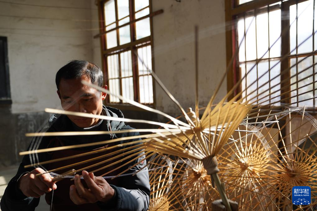 江西省婺源县赋春镇甲路村的工匠为甲路纸伞绕伞圈(1月11日摄)。