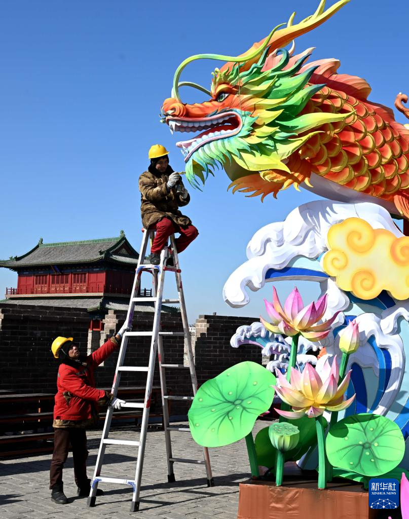 1月24日,工人在河北省石家庄市正定古城南城门安装花灯。