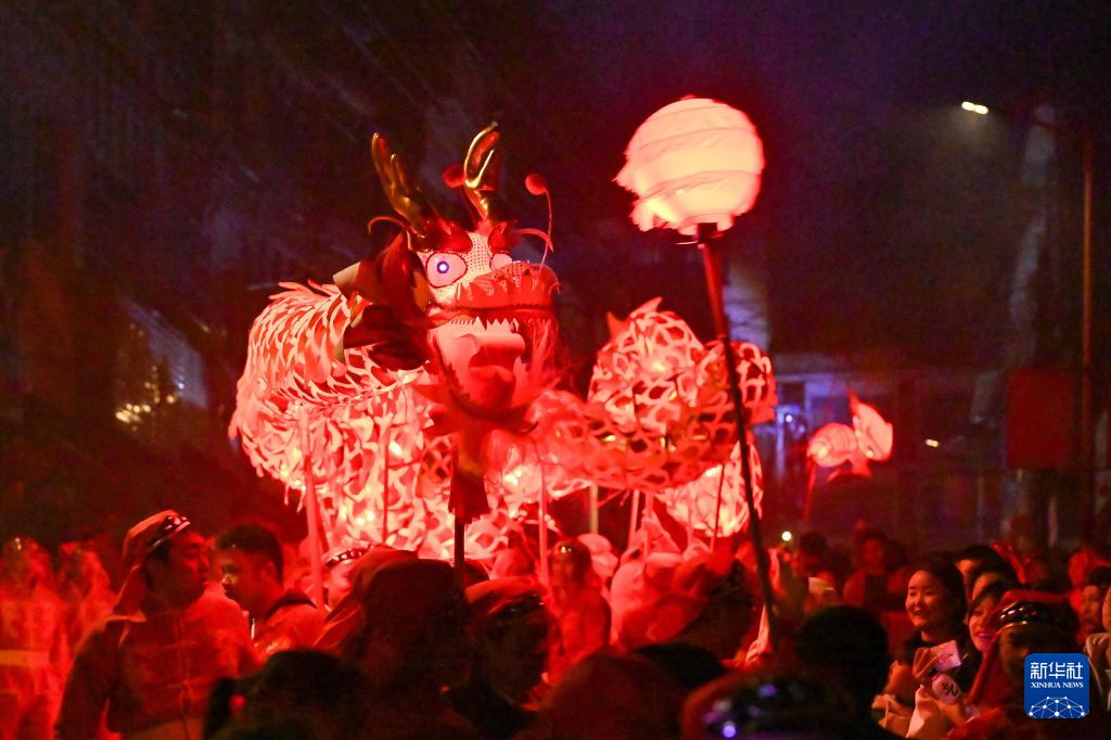 2月18日晚,湖南省永州市江华瑶族自治县图腾园广场,人们在参加龙狮灯会舞龙表演(无人机照片)。