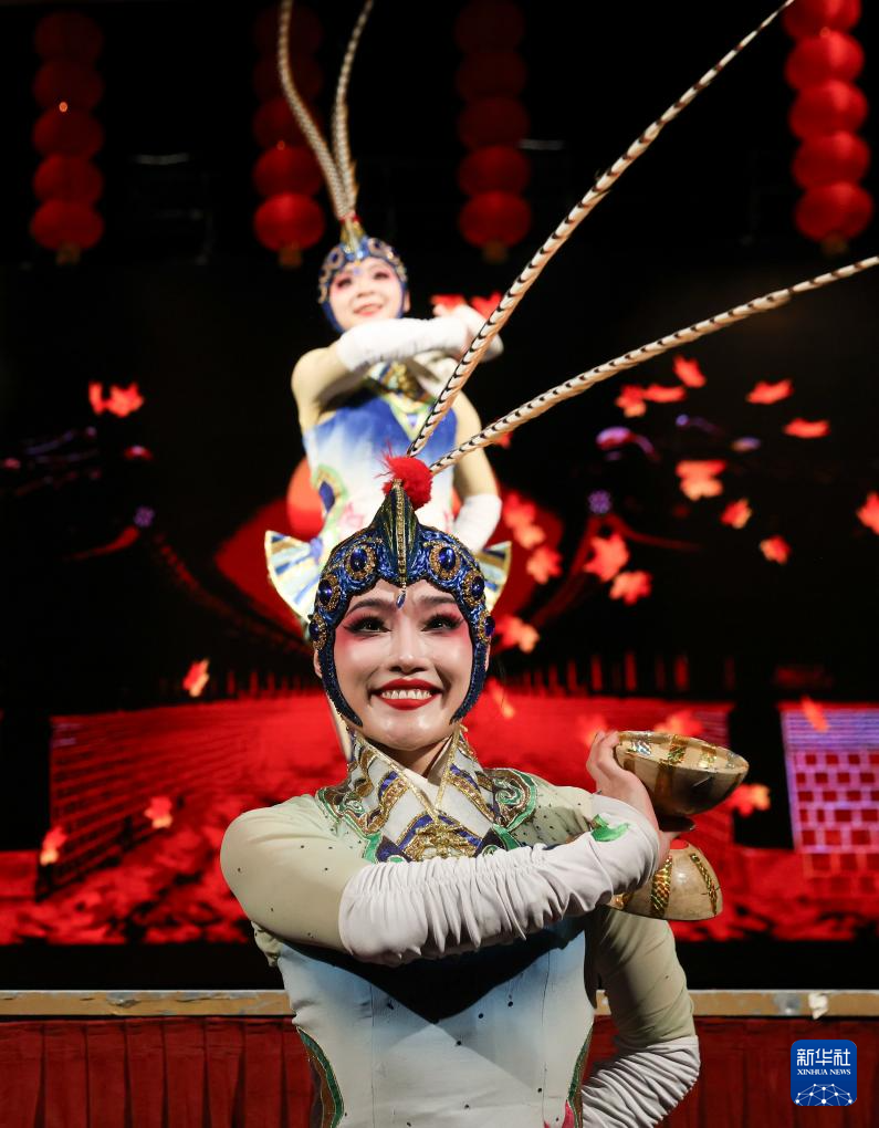 2月19日,演员在意大利罗马举行的“四海同春”慰侨访演活动上表演杂技《俏花旦——集体空竹》。