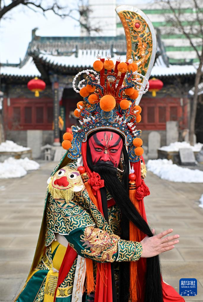 在太原市迎泽区庙前街,扮演关公的武凌云在文化展演活动上表演(2月23日摄)。