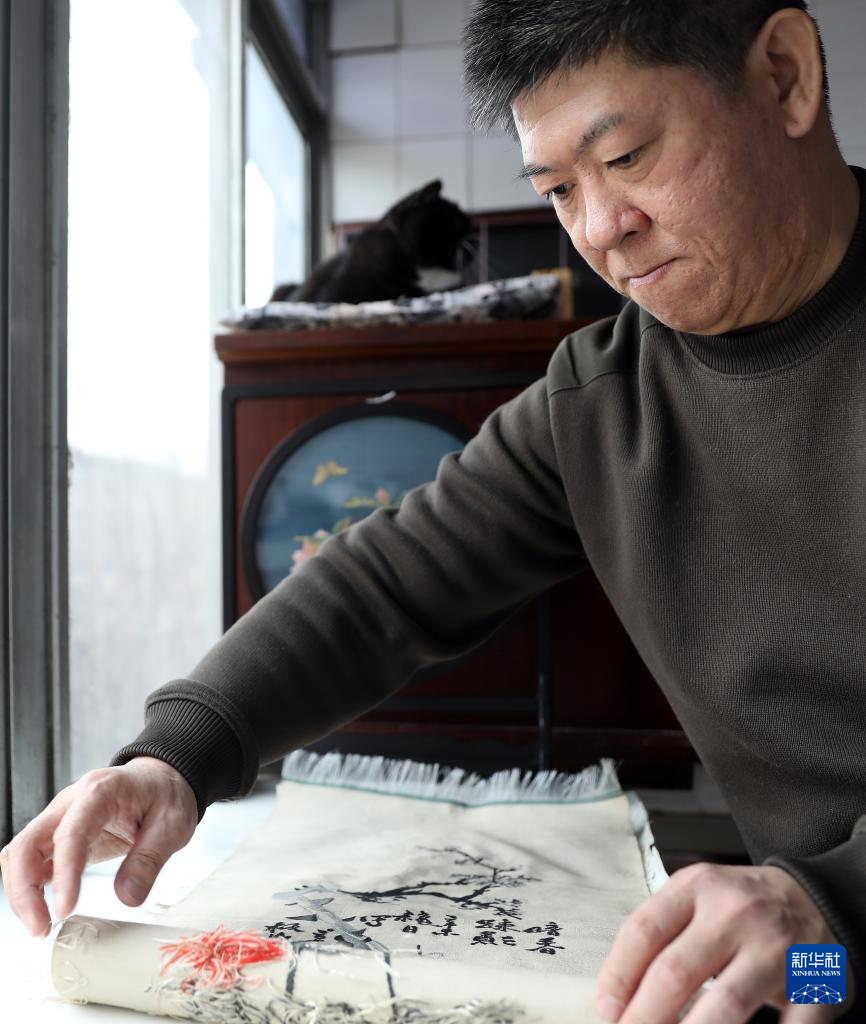 4月9日,申涛在位于营口市的家中卷起一幅未修剪毛头的缂丝半成品。