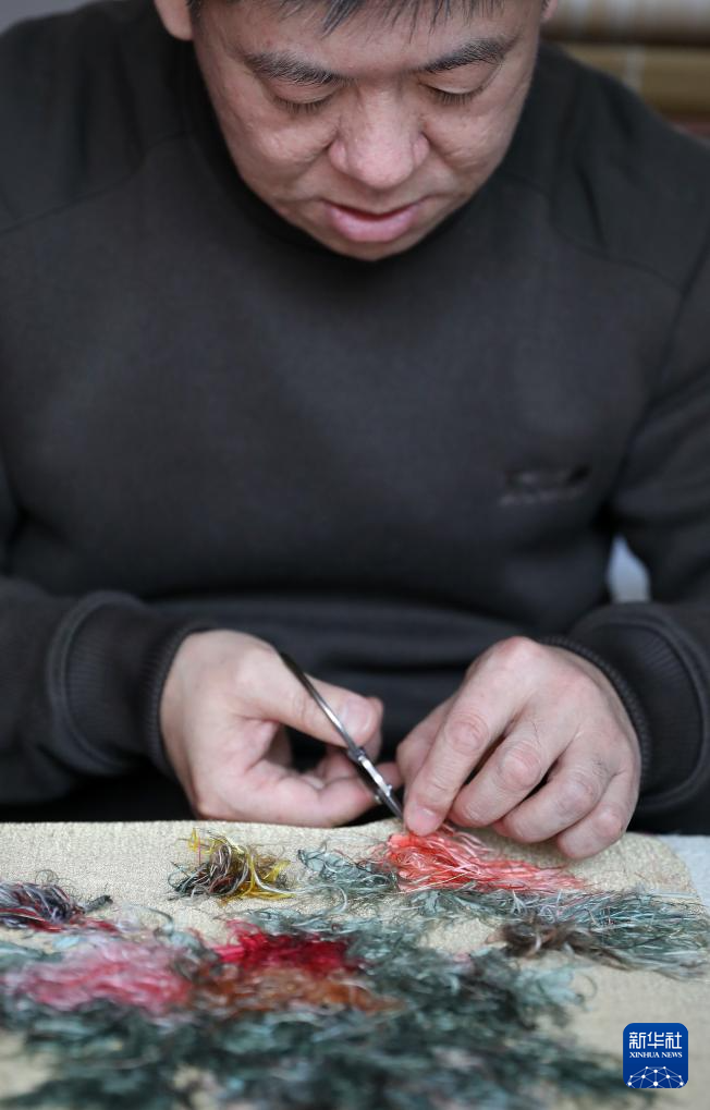 4月9日,在位于营口市的家中,申涛左手拿着缠着丝线的梭子,右手拿着梳理丝线的拨子进行缂丝作品创作。