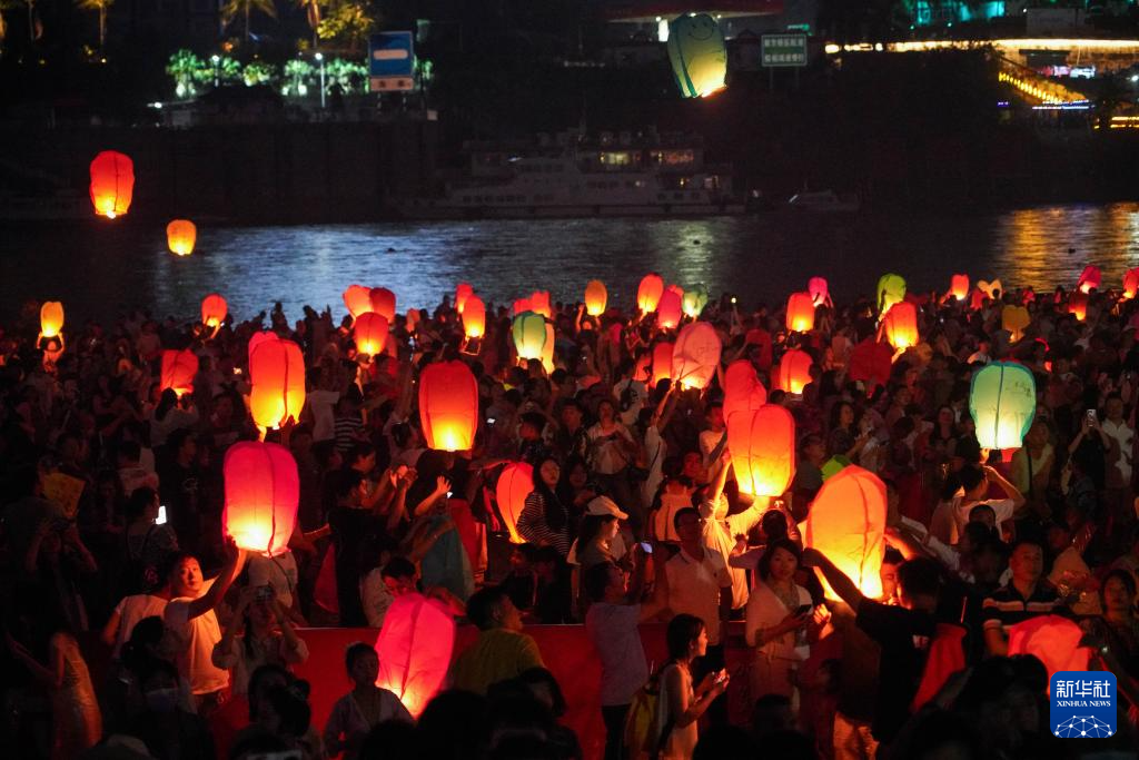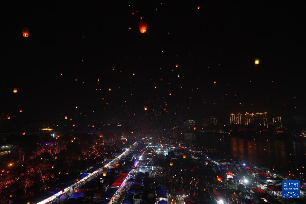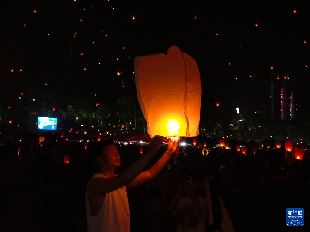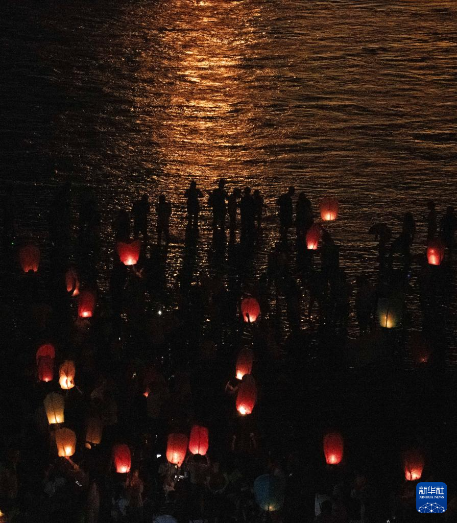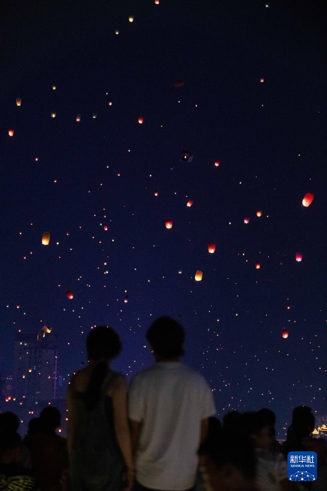 4月13日晚,在云南省西双版纳傣族自治州景洪市,人们在澜沧江边放飞孔明灯,庆祝泼水节。