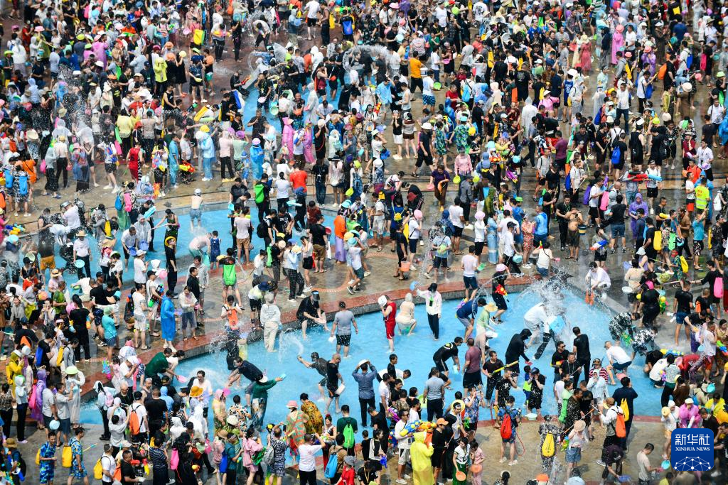 当日,云南省西双版纳傣族自治州举行泼水狂欢活动,人们欢聚在景洪市泼水广场,用相互泼水的方式互送祝福,庆祝泼水节。
