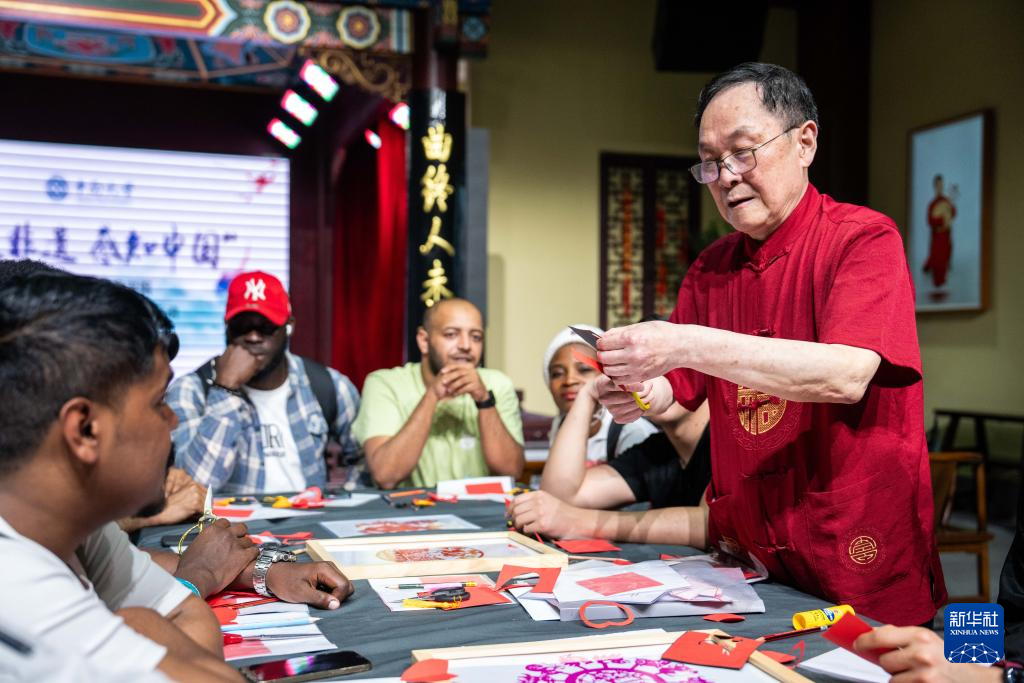 4月18日,在长沙非物质文化遗产馆,留学生体验剪纸。