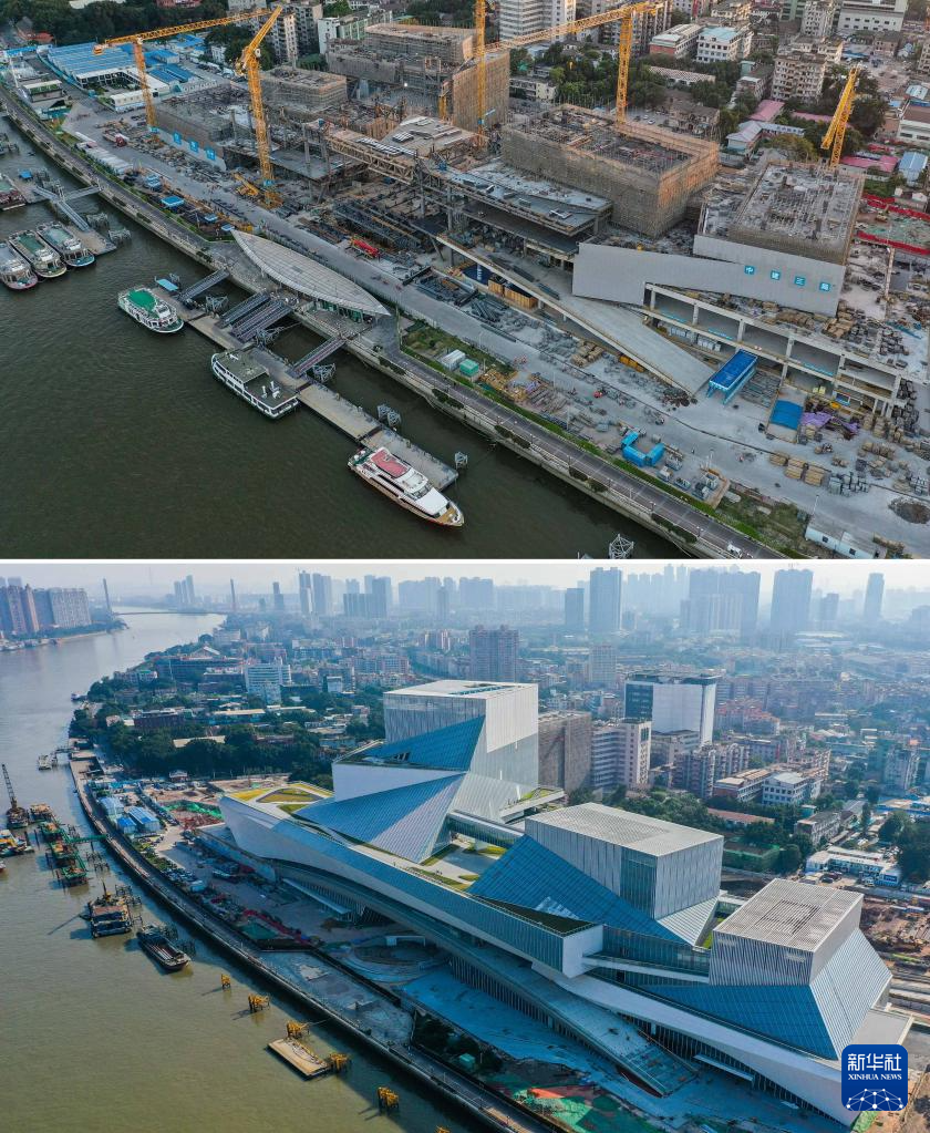拼版照片:上图为主体施工阶段的白鹅潭大湾区艺术中心(新华社发,2021年12月1日摄);下图为即将竣工的白鹅潭大湾区艺术中心(新华社记者刘大伟2023年11月25日摄)。