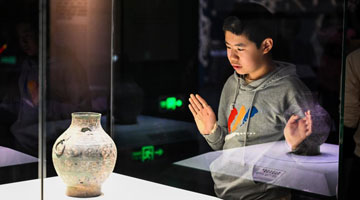 游客在参观赵州桥景区内保存的隋代“二龙戏珠”栏板(4月24日摄)。