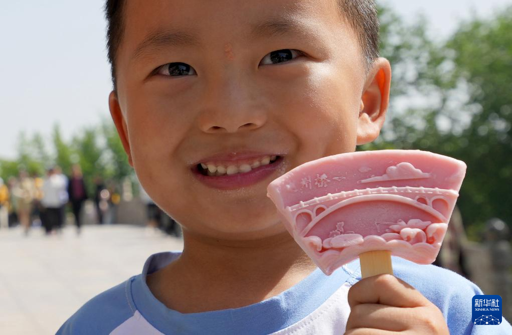 一名小朋友展示父母给买的赵州桥文创雪糕(4月25日摄)。