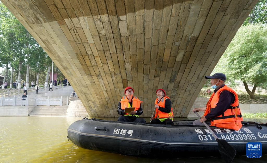 河北省建筑科学研究院有限公司的文物保护技术人员在勘察赵州桥桥底(4月25日摄)。