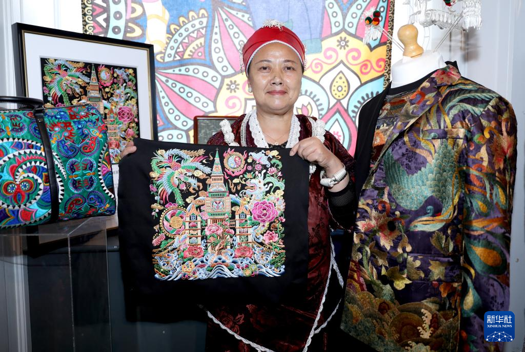 5月13日,在英国伦敦手工艺周“设计中国·和韵华夏”主题展上,中国手工艺人展示非遗技艺苗绣作品。
