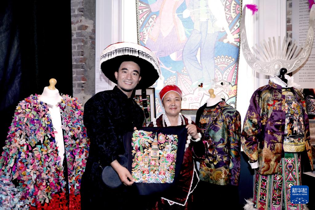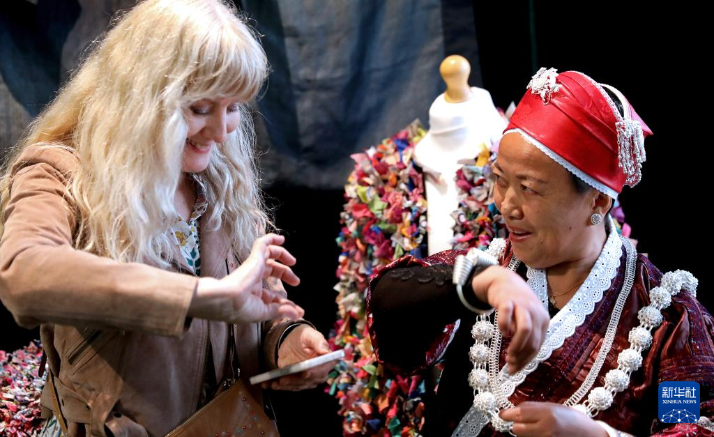 5月13日,在英国伦敦手工艺周“设计中国·和韵华夏”主题展上,来自贵州的设计师阿新(左)及其母亲展示非遗技艺苗绣作品。