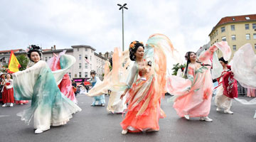 5月21日,在塞尔维亚首都贝尔格莱德,观众在“茶和天下·雅集”活动上观看采茶舞《时雨春风》表演。新华社发(王韡摄)