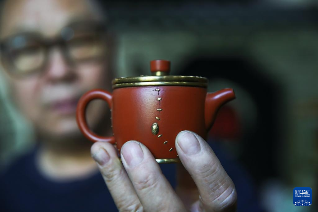 杨涛用“内锔”技艺修复的茶壶(5月8日摄)。