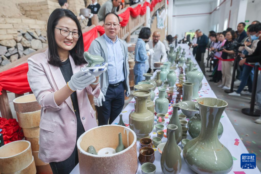 6月6日,在慈溪市上林湖青瓷传承园举行的开窑仪式上,嘉宾把越窑青瓷从匣钵内取出。
