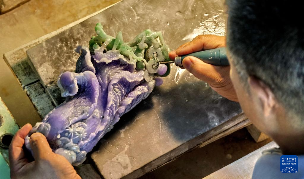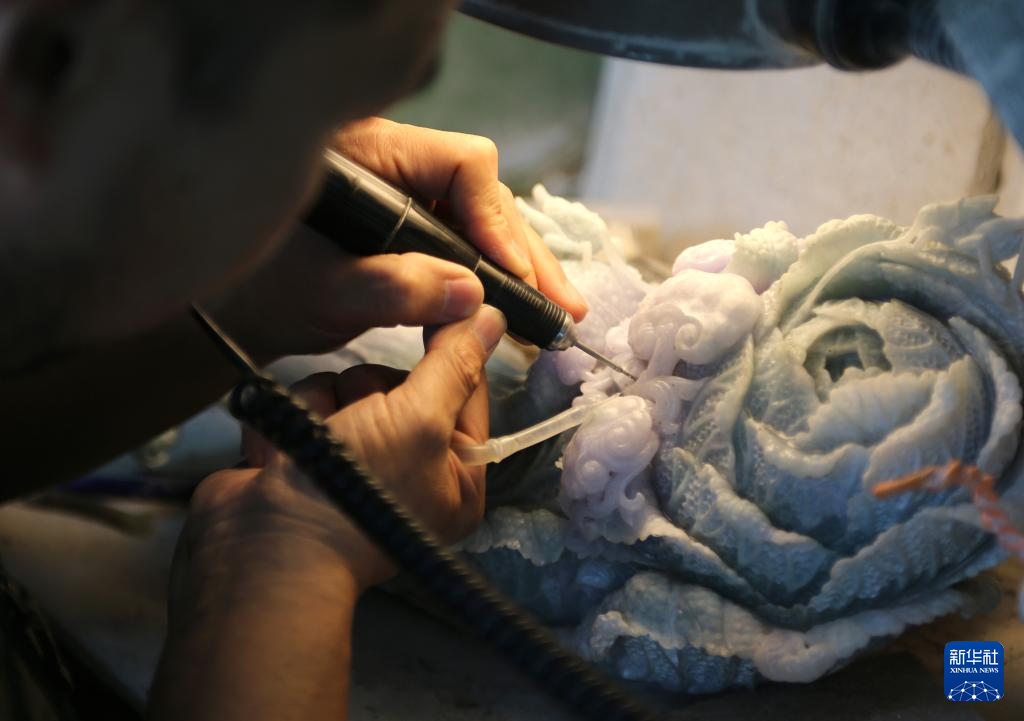 技师们在张铁成工作室内雕刻玉石(6月15日摄)。