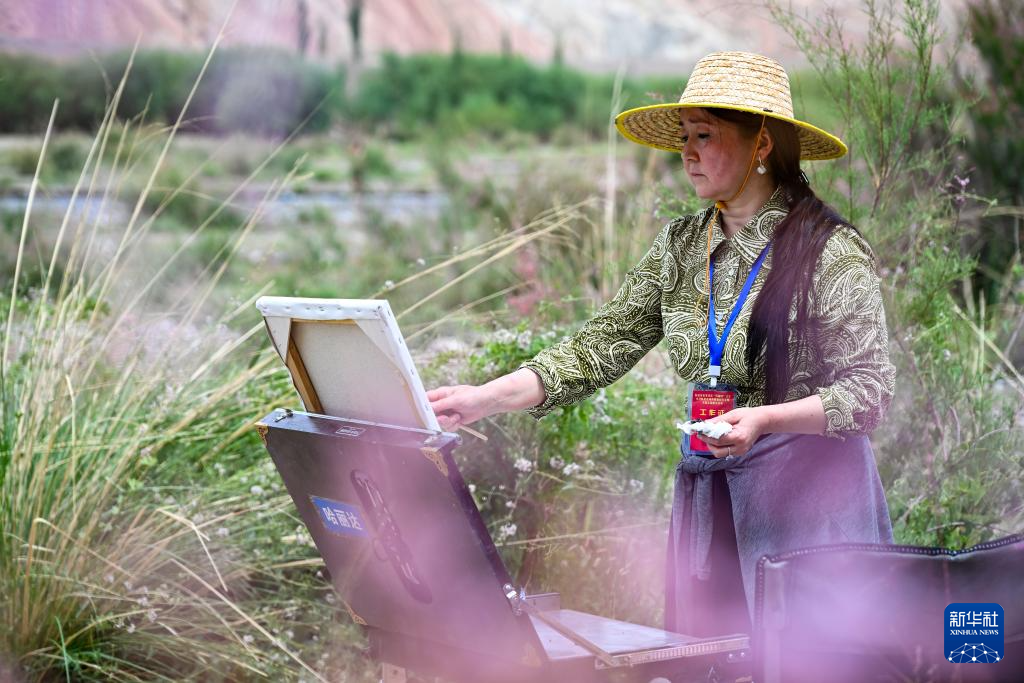 7月4日,在新疆克州阿图什市周边,小分队文化志愿者在写生创作。