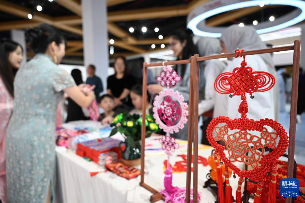 9月3日,人们在科威特艾哈迈迪省举行的“天涯共此时·湘约中东”文艺演出活动前参观中国传统文化展台。