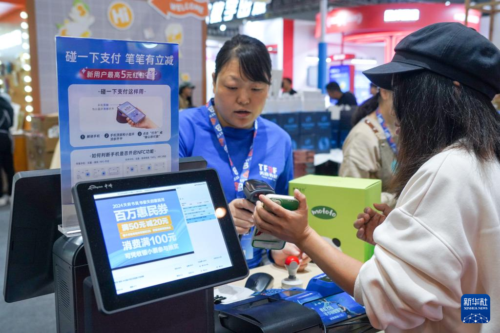 10月11日,读者在2024天府书展现场使用购书惠民券结账。