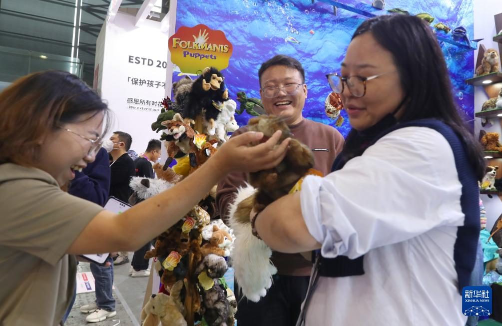 10月16日,一位参观者(左)在一家仿真毛绒玩具展商的展台上抚摸一个松鼠玩偶。