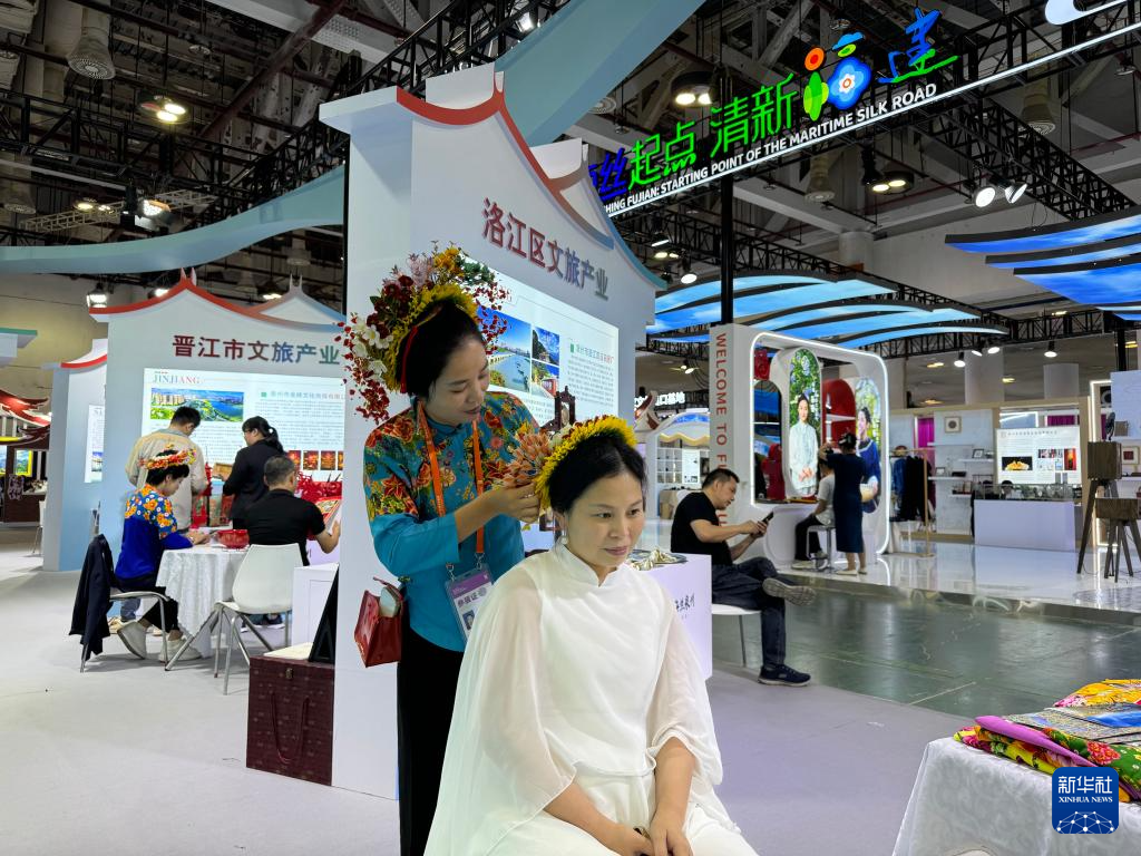 10月31日,客商在展会上体验蟳埔簪花。